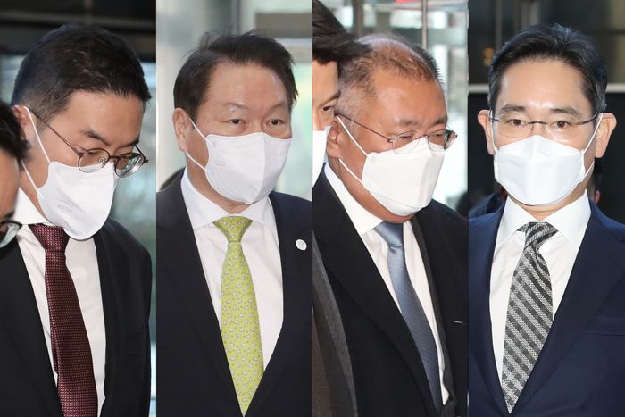 2일 서울 강남구 코엑스에서 열린 2023년 경제계 신년인사회에서 구광모 LG회장(왼쪽부터), 최태원 SK그룹 회장 겸 대한상공회의소 회장, 정의선 현대자동차그룹 회장, 이재용 삼성전자 회장이 참석하고 있다. ⓒ데일리안 김민호 기자