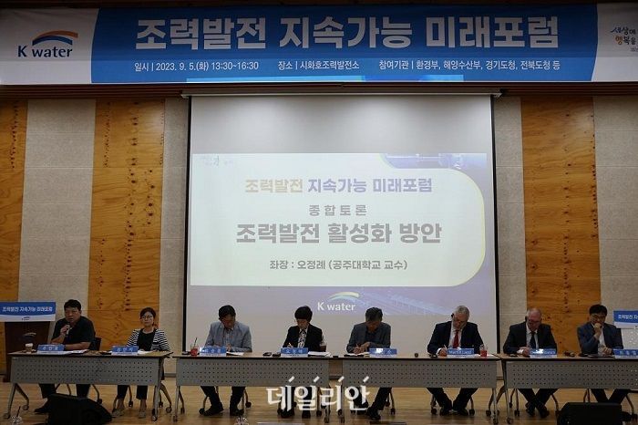 한국수자원공사는 5일 오후 경기도 안산시 시화호 조력발전소에서 ‘조력발전 지속 가능 미래 포럼’을 개최했다. 주제발표 이후 조력발전 활성화 방안 모색을 위해 진행된 공주대학교 오정례 교수를 좌장으로 한 토론에서 한국수자원공사 기후탄소사업처 주인호 처장(사진의 왼쪽)이 의견을 발표하고 있다. ⓒ한국수자원공사