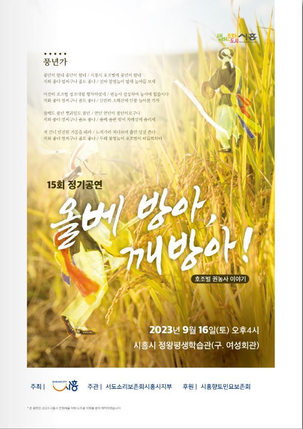‘올베방아, 깨방아!’는 시흥시 호조벌에서 부르던 들노래를 전통민요인 ‘서도소리’라는 장르와 결합해 전통문화 예술을 전승하고, 시민들에게 알리고자 마련됐다.