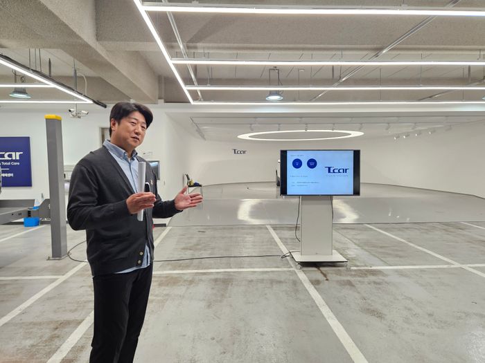 강병준 T카영업팀 팀장이 지난 8일 경기 부천시에 위치한 국민차매매단지 부천점에서 중고차 브랜드 T car를 소개하고 사업 전략에 대해 발표하고 있다. ⓒ데일리안 정진주 기자