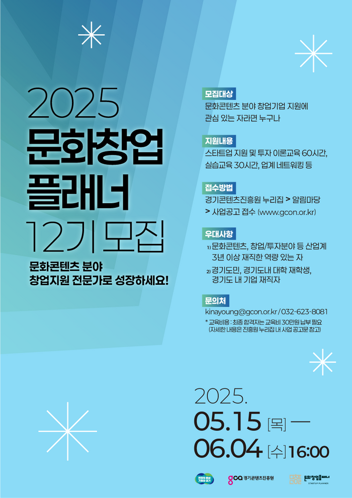 경기콘텐츠진흥원(이하 경콘진)은 문화콘텐츠 분야 창업 지원 전문 인력 양성 프로그램인 ‘문화창업플래너’ 12기 교육생을 다음달 4일까지 모집한다고 15일 밝혔다.