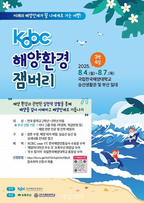 한국해양진흥공사(사장 안병길, 이하 해진공)가 오는 30일까지 미래 해양 인재 양성을 위해 진행하는 ‘2025 KOBC 해양환경잼버리’ 1기 참가자 모집 안내 포스터. ⓒ한국해양진흥공사