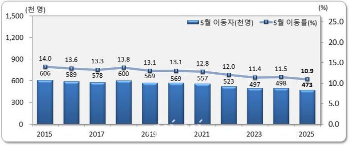 25일 통계청이 발표한 ‘2025년 5월 국내인구이동통계’에 따르면 지난달 이동자 수는 47만3000명으로 전년 동월 대비 2만5000명 줄었다.