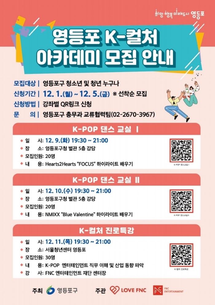 서울 영등포구(구청장 최호권)가 글로벌 K-컬처에 관심 있는 청소년과 청년을 대상으로 '댄스교실'과 '진로특강'으로 구성된 '영등포 K-컬처 아카데미'를 운영하고, 참가자를 모집한다고 2일 밝혔다.