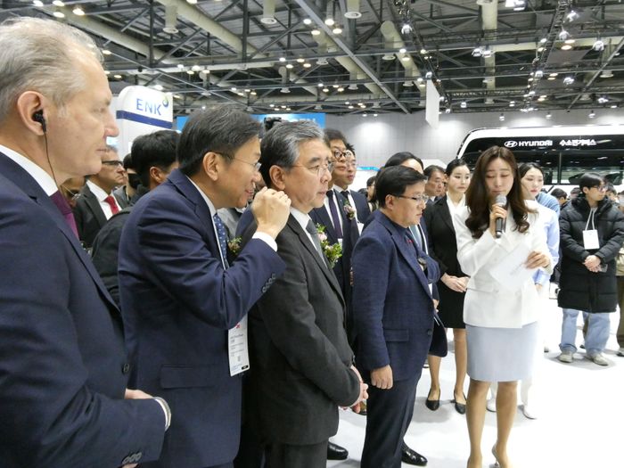 먼저, 현대차그룹은 이번 전시에서 2세대 700바 규모의 '이동형 수소 충전소'를 선보인다.
