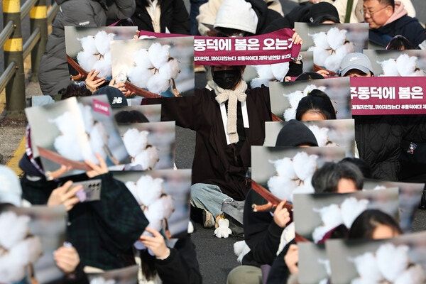 동덕여대재단을 규탄하는 집회에서동덕여대교화인 목화 팻말을 들고 구호를 외치고 있다.ⓒ연합뉴스