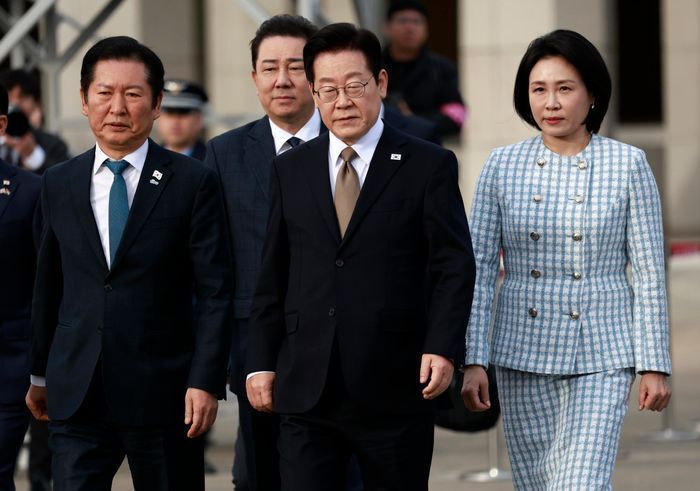 남아공 G20 정상회의 참석차 순방길에 오르는 이재명 대통령과 김혜경 여사가 17일 경기 성남 서울공항에서 공군 1호기로 향하고 있다. 왼쪽은 정청래 더불어민주당 대표 ⓒ뉴시스