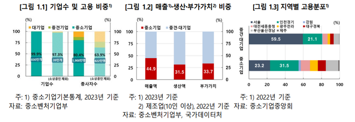 보고서에 따르면 우리나라 중소기업은 전체 기업 수의 99.9%와 고용의 80.4%를 차지하고 있다.