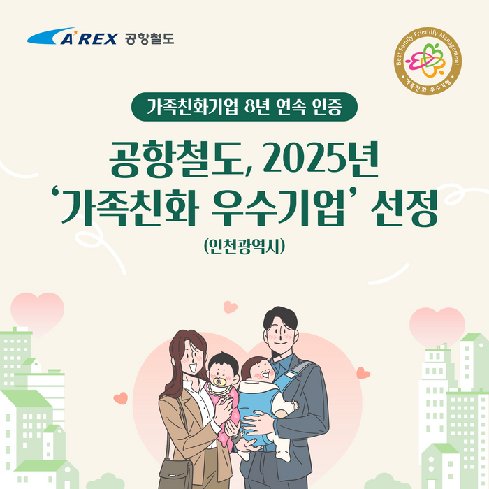 공항철도는 가족친화제도의 운영 성과로 ‘가족친화기업 재인증’과 ‘2025년 가족친화인증 우수기업’ 으로 선정됐다고 8일 밝혔다.