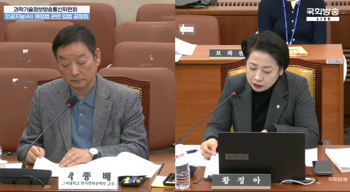 9일 국회 과학기술정보방송통신위원회에서 열린 ‘AI 제정법’ 관련 공청회’에서 박종배 건국대학교 전기전자공학부 교수가 황정아 의원의 질의에 답하고 있다.국회방송 캡처