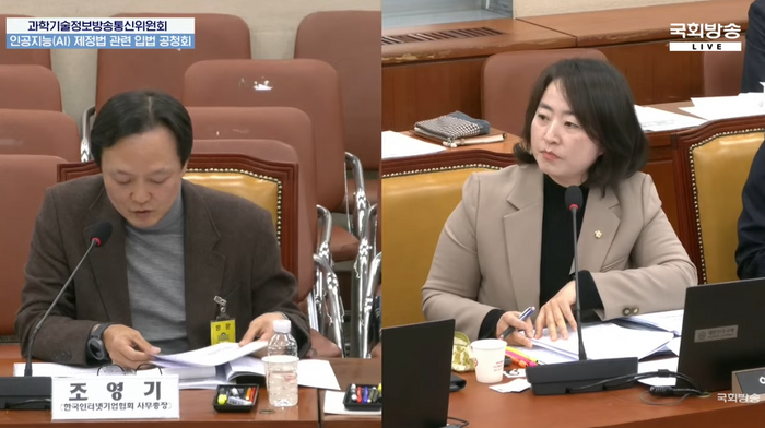 9일 국회 과학기술정보방송통신위원회에서 열린 ‘AI 제정법’ 관련 공청회’에서 조영기 한국인터넷기업협회 사무총장이 이주희 의원의 질의에 답하고 있다.국회방송 캡처