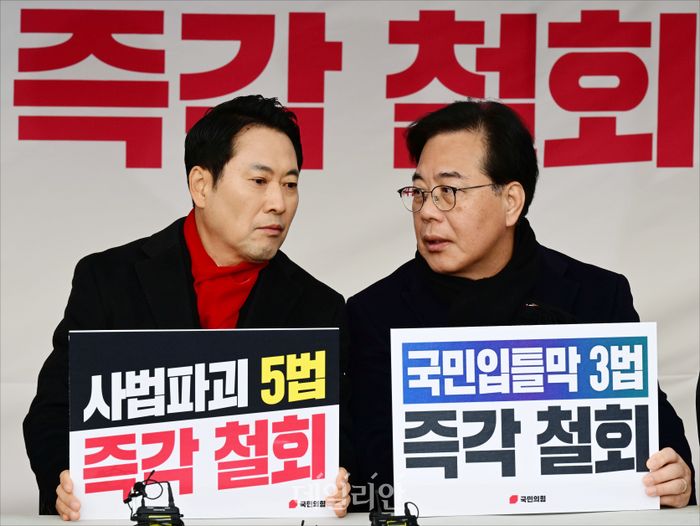 국민의힘 장동혁 대표와 송언석 원내대표가 10일 오전 서울 여의도 국회 본청 앞에 설치된 '8대 악법 저지' 릴레이 천막 농성장에서 대화를 하고 있다.