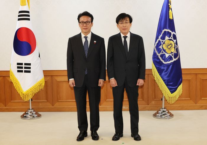김민석 국무총리가 11일 서울 종로구 정부서울청사에서 열린 의료혁신위원회 민간위원 위촉장 수여식에서 정기현 위원장에게 위촉장을 전달한 뒤 기념 촬영을 하고 있다. ⓒ연합뉴스