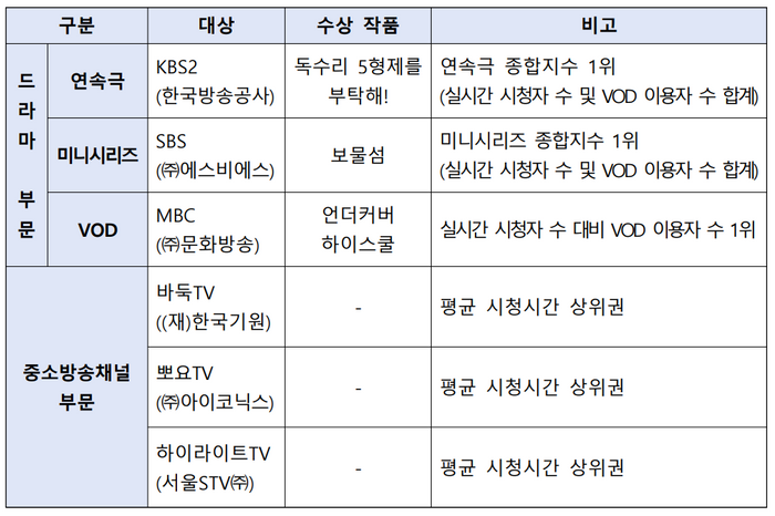 이번 방송대상은 IPTV 3사의 셋톱박스 데이터를 통합한 ‘TV INDEX’와 각 사의 VOD 이용 데이터를 기반으로, 드라마 부문과 중소 방송채널 부문으로 나눠 진행됐다.
