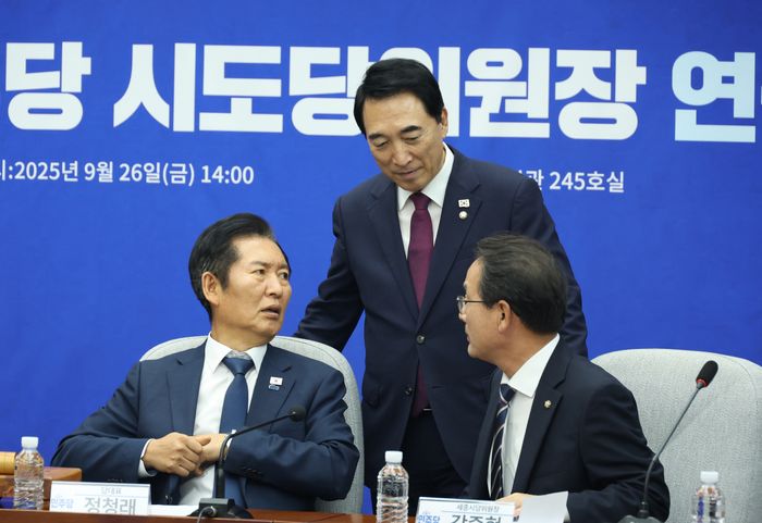 더불어민주당 정청래 대표, 강준현 세종시당위원장, 박수현 수석대변인이 지난 9월 국회에서 열린 시도당위원장 연석회의에서 대화하고 있다. ⓒ뉴시스