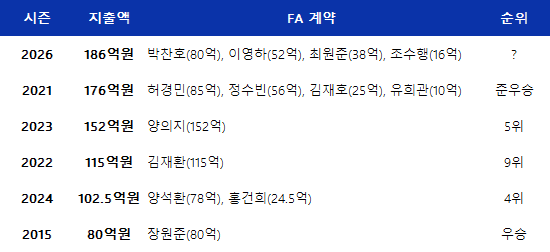 종전 한 시즌 최고액을 기록했던 2021년에는 허경민, 정수빈, 김재호, 유희관 등 내부 FA를 잡는데 주력하며 176억원을 썼고 준우승의 성과로 팀 성적이 드러났다.