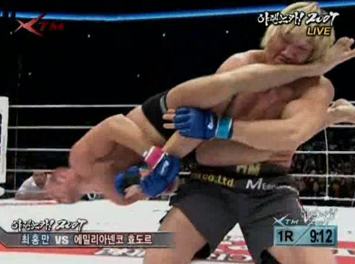 하지만 씨름으로 무장된 최홍만은 엄청난 허리힘으로 오히려 표도르를 쓰러뜨렸고, 잠시 숨을 고른 뒤 파운딩으로 상대를 공략했다.